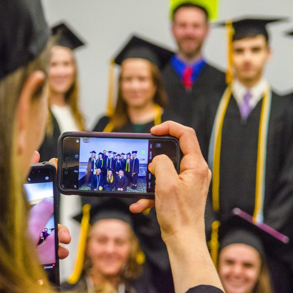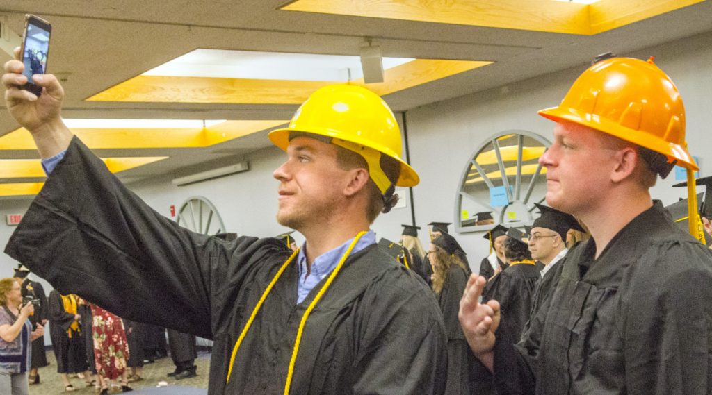 Erik Anderson, left, snaps a selfie Saturday with fellow electrical lineworker technology graduate Seth Blanchard before the Kennebec Valley Community College graduation at the Augusta Civic Center. Staff photo by Joe Phelan