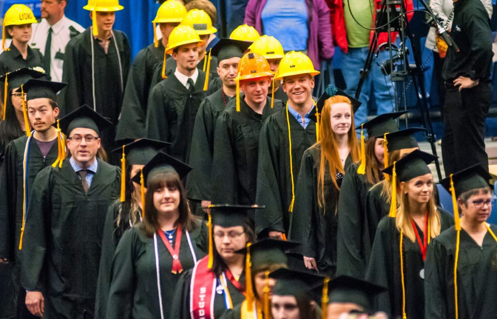 AUGUSTA — Wearing a hard hat like the rest of the electrical lineworker program graduates gathered around him while preparing to march into Kennebec Valley Community College’s commencement, Brian Zwicker smiled as he saw his 5-year-old son, Ryan, approaching him wearing a bright-yellow hard hat that matched his own, only smaller.