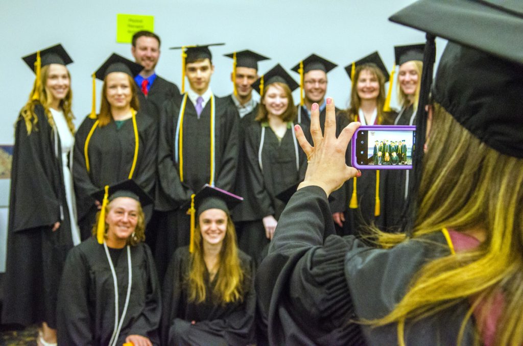 Physical Therapy Assistant graduates pose as one of their instructors Jessica Gleason takes the group shot on Saturday before the Kennebec Valley Community College graduation in the Augusta Civic Center. Gleason took the photos about ten times using different phones. Staff photo by Joe Phelan