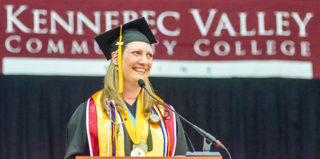 Nursing program graduate Lori Cobb, KVCC’s student of the year, likened being a college student to being a duck. From above the surface of the water, she said, swimming ducks may look relaxed, “but underneath it all, we’re just struggling and paddling as fast as we can.”
