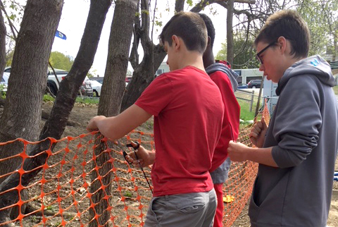 Lewiston JMG students Evan Williams, left, and Brian York help install fencing around the perimeter of the after-school programs children’s play area in support of the YMCA.