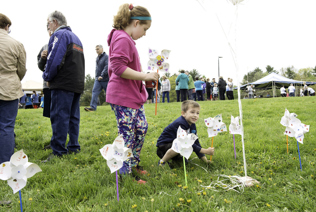 Alexis York, 9, and her brother, Landen Bowden, 5, place memorial pinwheels in memory of their great uncle, Al Pray, prior to the start of the 10th Annual Hospice House 5K in Auburn on Sunday. People could make pinwheels to help mark the event’s ten-year anniversary. (Daryn Slover/Sun Journal)