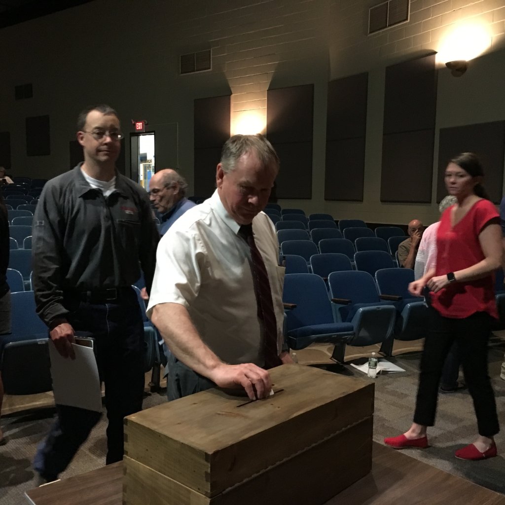 Buckfield Junior-Senior High School Principal George Reuter casts his vote for a written ballot at the RSU 10 budget meeting Wednesday. Voters approved a budget of $26.48 million. (Marianne Hutchinson, Rumford Falls Times)