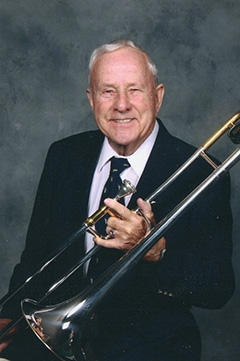 At the age of 11, Ralph started playing the trombone. He played in the Webster Junior High band under Russell Jack Sr., and the Edward Little High School band under the baton of Donald Gay. He also played in the dance band “The Varsitters,” a 16-piece band. Ralph also played in the St. Cecilia Boys Band under the direction of Leo Grenier and at the same time also played in the Le Montagnard Snowshoe Club band. These two bands played concerts in the bandstand in the Lewiston City Park on Sunday nights during the summer.