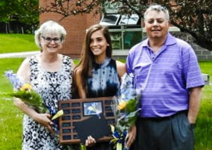Julie and Steve Shible present this year’s cheer-leading scholarship to Brianna Jackson, center, on May 25. Jackson is the 33rd recipient of the award since it was created to memorialize their daughter, Jamie Shible, who passed away in 1997. The award was presented in front of Jamie’s Tree at Mt. Blue High School.