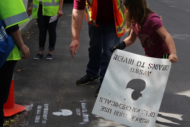 The stencils will mark the street near municipal drainage inlets, also known as catchbasins. Stormwater is precipitation that doesn’t soak into the ground; rain that flows from rooftops to lawns, across driveways and then into sidewalks and roads is collected by these storm drains and discharged, untreated, into local bodies of water. Along its way, stormwater has collected pesticides and fertilizers, bacteria from pet waste, oil and petroleum, sediment, trash and cigarette butts.