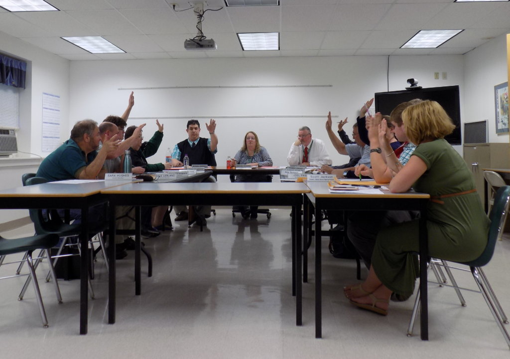 The Regional School Unit 73 board of directors accepted the resignation Thursday night of Superintendent Kenneth Healey. Healey, right at the head of the table, will leave the district at the end of June. (Pam Harnden/Livermore Falls Advertiser)
