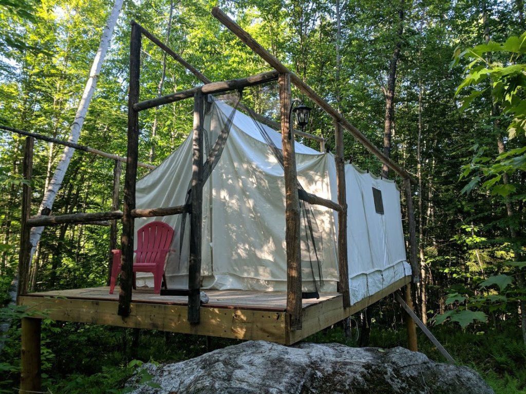 This tent on a platform in the woods, which was booked by the writer on a mosquito-filled weekend in early June, is one of several options offered by Toad Hill owner Justin Fisher in Chatham, New Hampshire. (Mark LaFlamme/Sun Journal)