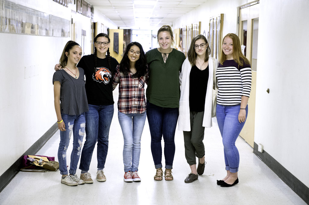 Maddie Thistlewaite, left, Evelyn Bilodeau, Johana Jimenez, Rebecca Raymond, Samantha Weekley and Megan Perkett graduated from Edward Little High School on June 2 with college credits already in hand. (Daryn Slover/Sun Journal)