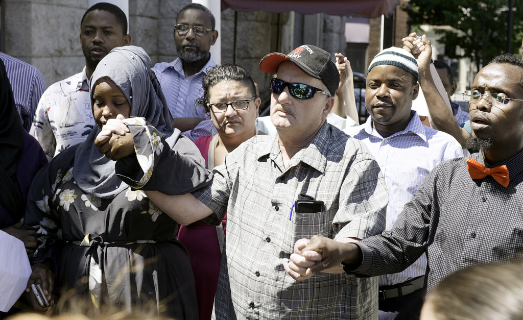 Jim Thompson of Auburn holds hands with Fowsia Musse, left, and Abdi Abdalla in downtown Lewiston during a gathering Sunday morning against rising ethnic tensions. Thompson is the uncle of Donald Giusti, who died from injuries he received when he was beaten Tuesday night near Kennedy Park. (Daryn Slover/Sun Journal)