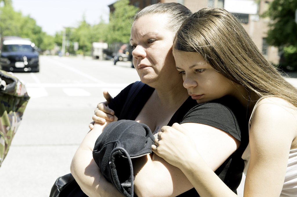 Tina Giusti and her daughter, Rayenelle Crockett, 15, listen Sunday morning to a message delivered by members of the ethnic community in downtown Lewiston. Giusti’s brother, Donald, died from injuries he received Tuesday night when he was beaten near Kennedy Park. (Daryn Slover/Sun Journal)