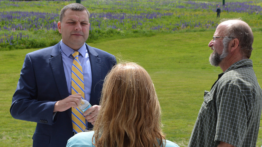 Sebastian Monsour, left, chief executive officer of the Majella Group based in Australia, talks with people at a June 2017 news conference about the group buying Saddleback Mountain Resort in Sandy River Plantation. (Sun Journal file photo)