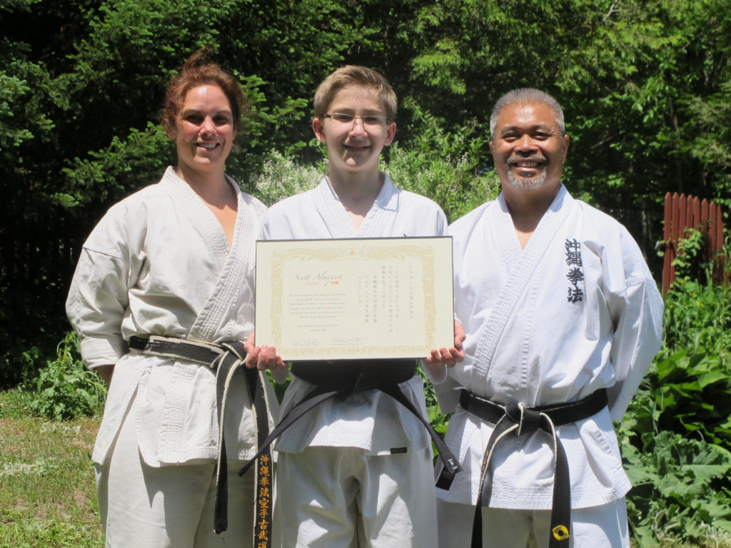 Pelletier’s Karate Academy also wishes to congratulate Scott Almquist for achieving the rank of Black Belt. Scotty began studying at Pelletier’s at the age of three and has continued to train for the past ten years. To receive his black belt, he demonstrated proficiency in traditional kata (the forms and patterns of karate), kobudo (traditional Okinawan weapons), self-defense, sparring, and knowledge of the art as well as demonstrating the ability to teach.