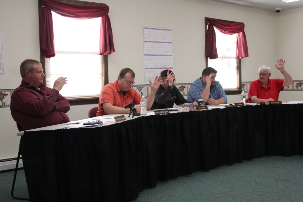 Paris selectmen, from left, Chris Summers, Scott Buffington, Gary Vaughn, John Andrews and Chairman Rusty Brackett, vote Monday evening to appoint an ad-hoc committee to draft a private property safety ordinance. (Matthew Daigle/Sun Journal)