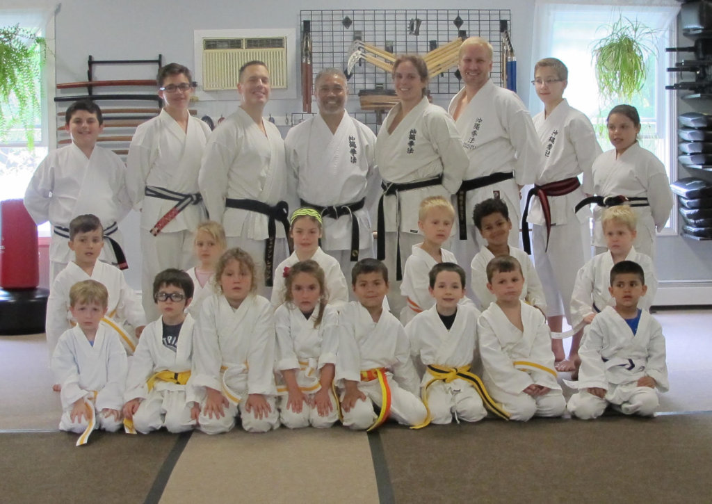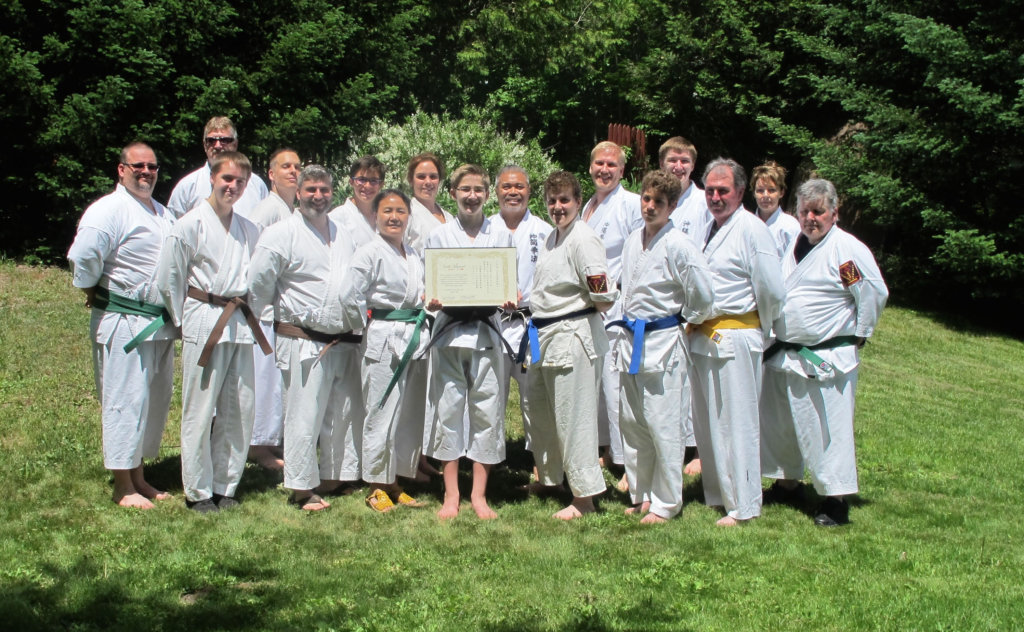 Pictured are (left to right):Front row: JP Cote, Alex Reblin, Zach Lampron, Ping Clavett, Scotty Almquist, Olivia Morin, Rocco Landry, Simon Theberge, Bob Labbe; Back row: Sensei Mike Bourget, Jason Rebling, Jack Anderson, Shihan Sadie Landry, Deshi Sensei Matt Vattaso, Sensei Per Almquist, Jason Almquist, Judy Castonguay.