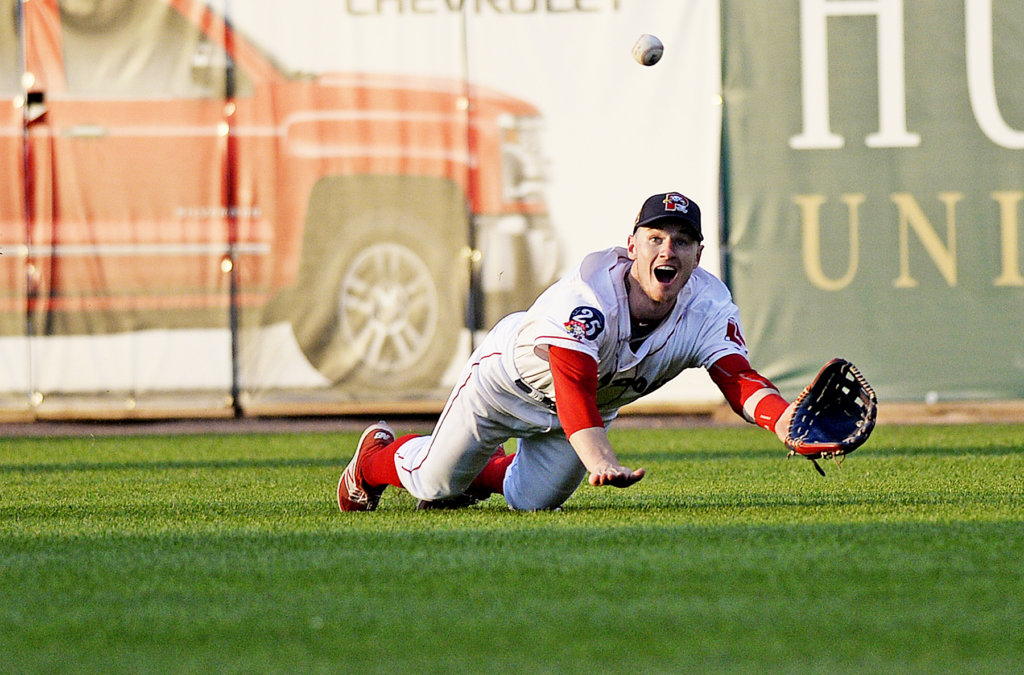 Portland’s Danny Mars attempts to make a diving catch against Binghamton on Tuesday. Mars was unable to catch the ball but he stopped it and held the runner to a single. (Shawn Patrick Ouellette/Portland Press Herald)