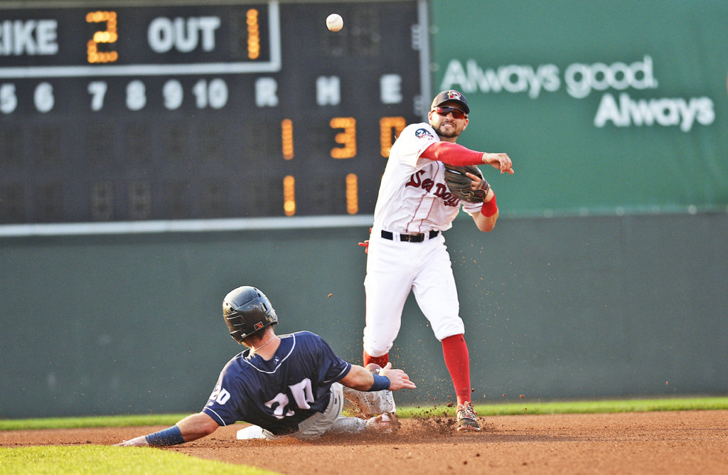 Portland’s Chad De La Guerra turns a double play as Binghamton’s Joey Terdoslavich slides into second base Tuesday. (Shawn Patrick Ouellette/Portland Press Herald)