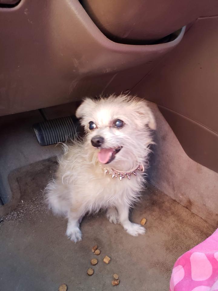 “She was so dirty and looked malnourished,” Smith said. “She had knots all through her fur and almost what looked like a black, gummy material stuck in her knotted-up fur. She was so nervous and skittish she jumped out and hid under my car.”