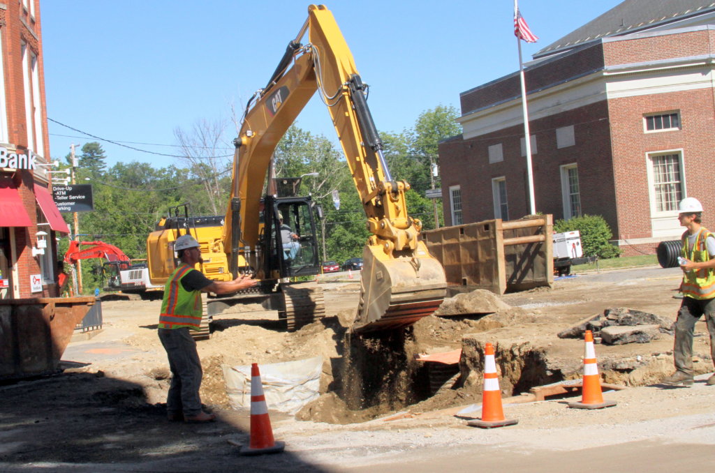 A crew from Sargent Corp. works Thursday on the Hartford Street portion of the downtown project in Rumford. (Bruce Farrin/Rumford Falls Times)