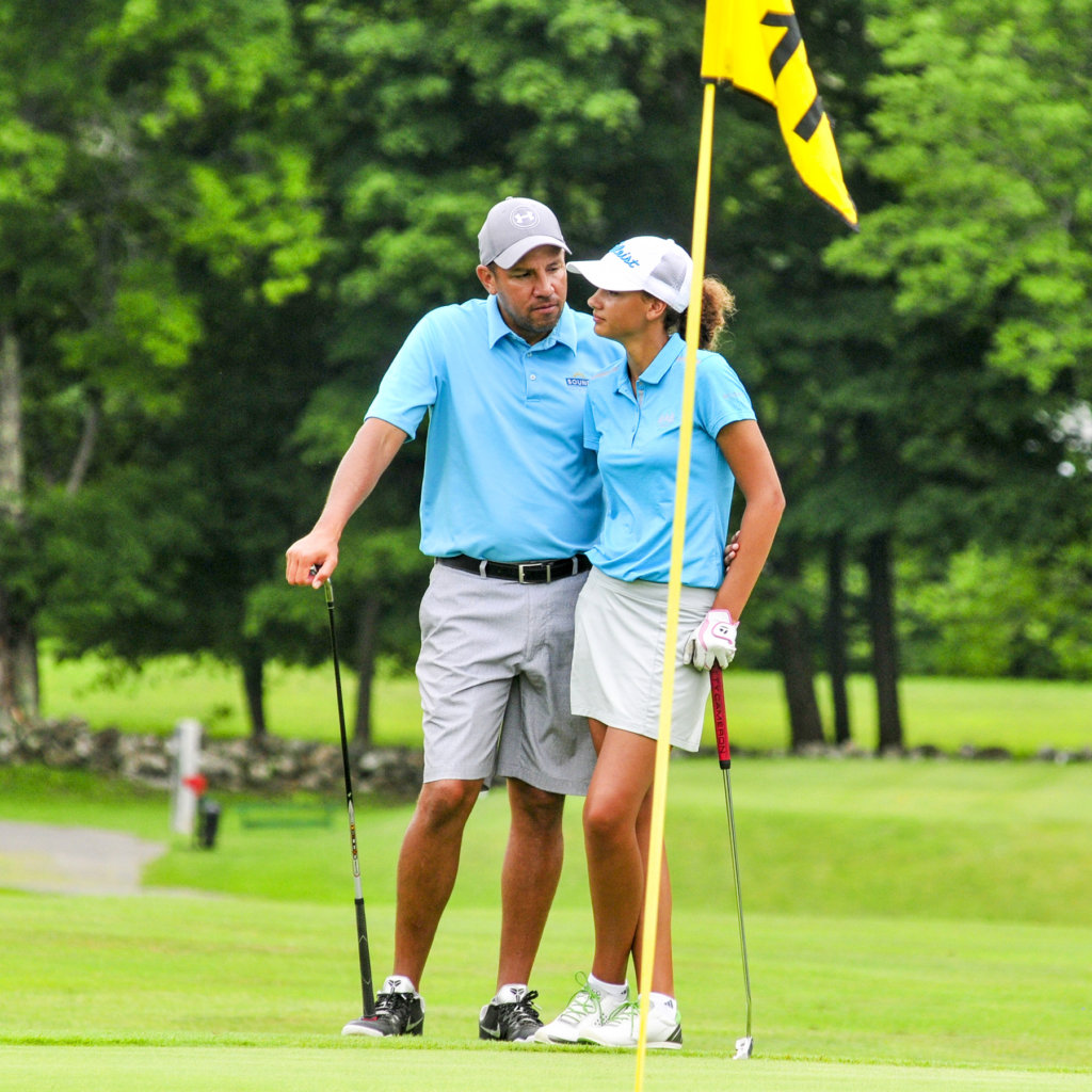 Harry Haylock, left, caddies for his daughter Ruby Haylock, of Turner Highlands Country Club, in the Maine Women’s Amateur on Tuesday at the Rockland Golf Club. (Joe Phelan/Kennebec Journal Photo)