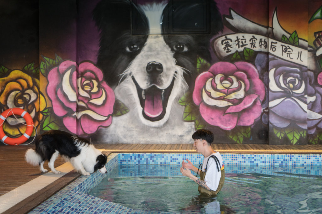 Zhou Tianxiao instructs Sylar, a border collie, to jump into the pool at his pet mansion in Beijing that also has a spa and a trampoline. (Photo for The Washington Post by Yan Cong)