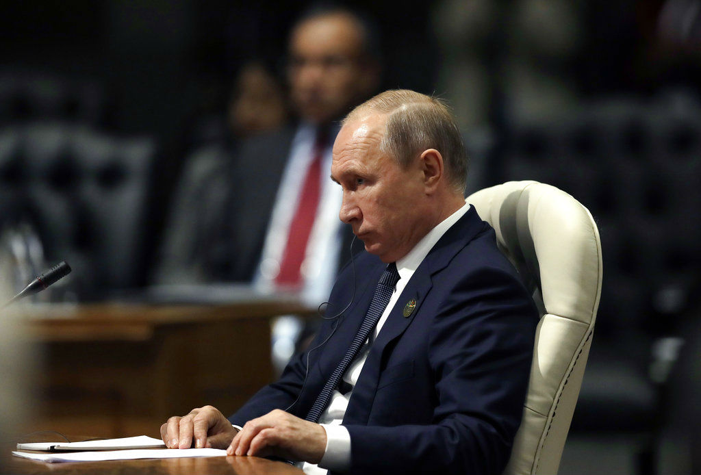 Russian President Vladimir Putin looks on during the BRICS Summit in Johannesburg, South Africa, Thursday, July 26, 2018. The summit runs through Friday with various heads of BRICS attending. (AP Photo/Themba Hadebe, Pool)