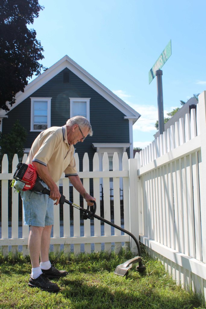 Everett Parlin trims weeds around his lawn at Cummings Place in Norway on Tuesday afternoon. Parlin said his lawn was the site of a house built in 1904 that was demolished because of its dilapidated condition. (Matthew Daigle/Sun Journal)