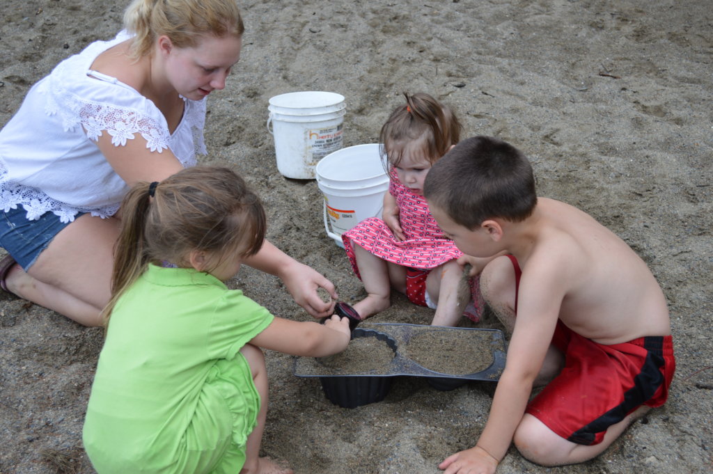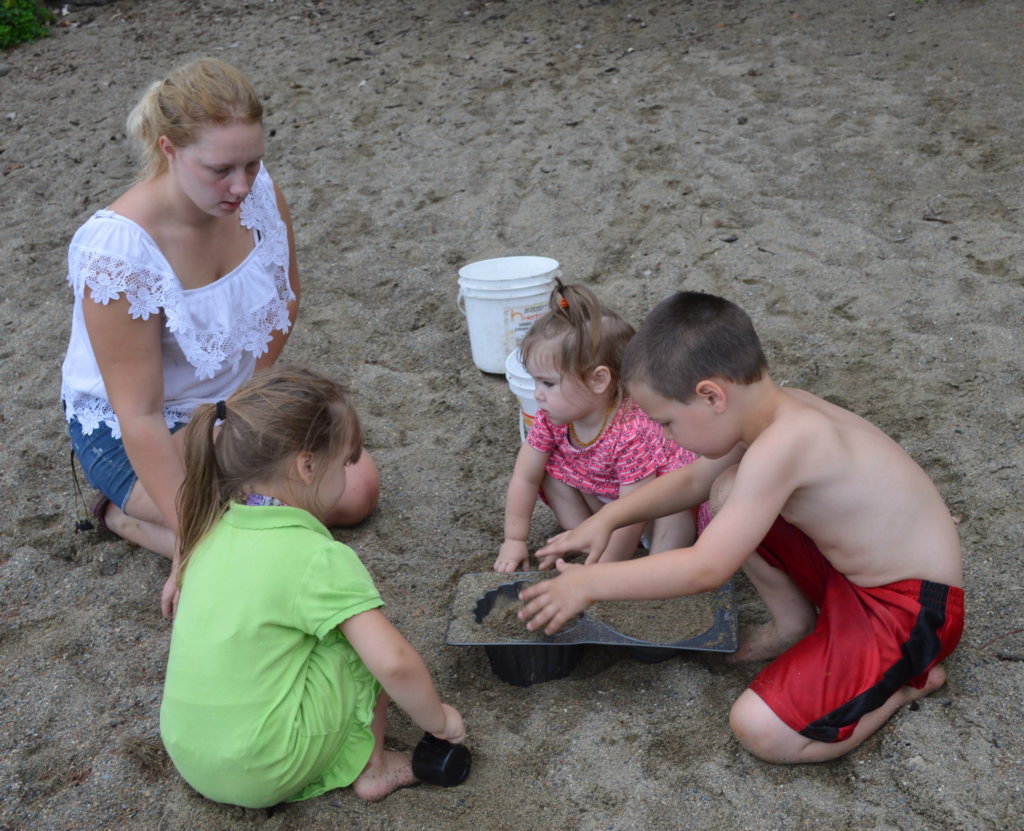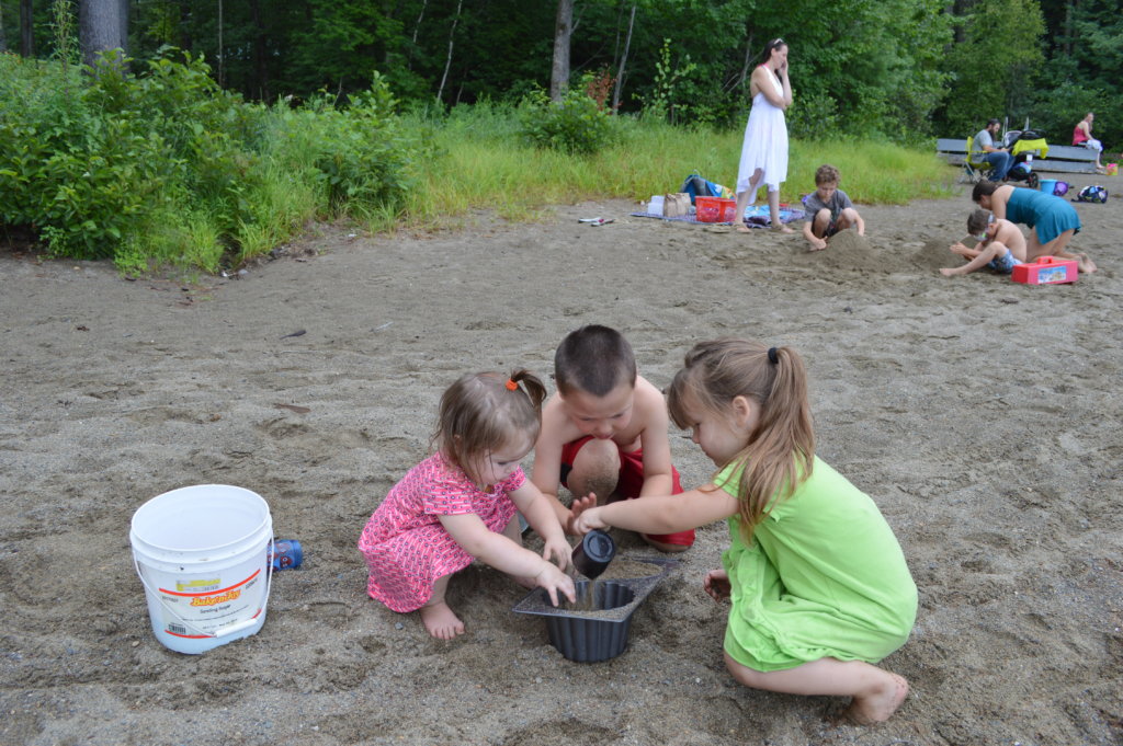 Juniper Collins, 4, left, of Wilton, baby sitter Lacey Duval of Wilton, Juniper’s sister Callie Collins, 2, and her brother, Randy Collins, 5, prepare to build a sandcastle Thursday morning on the shore of Wilson Pond at Kineowatha Park in Wilton. (Donna M. Perry/Sun Journal)