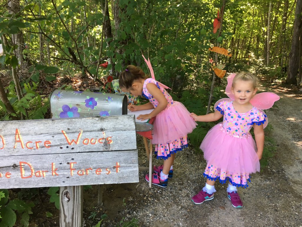 Isla Haynes, 2, waits for her turn while her sister, Nora Haynes, 5, signs the guest book at the Fairy Walk in Peru on Friday. The girls visited the fairy house displays along the wooded path with their mother, Erin Haynes, and their grandmother, Cindy Kelley. Fairy Walk owner Mary Pulsifer is in her 10th year of creating fairy house displays for people of all ages. The walk is free and is open from dawn to dusk from Memorial Day to a week after Labor Day. (Marianne Hutchinson/Rumford Falls Times)