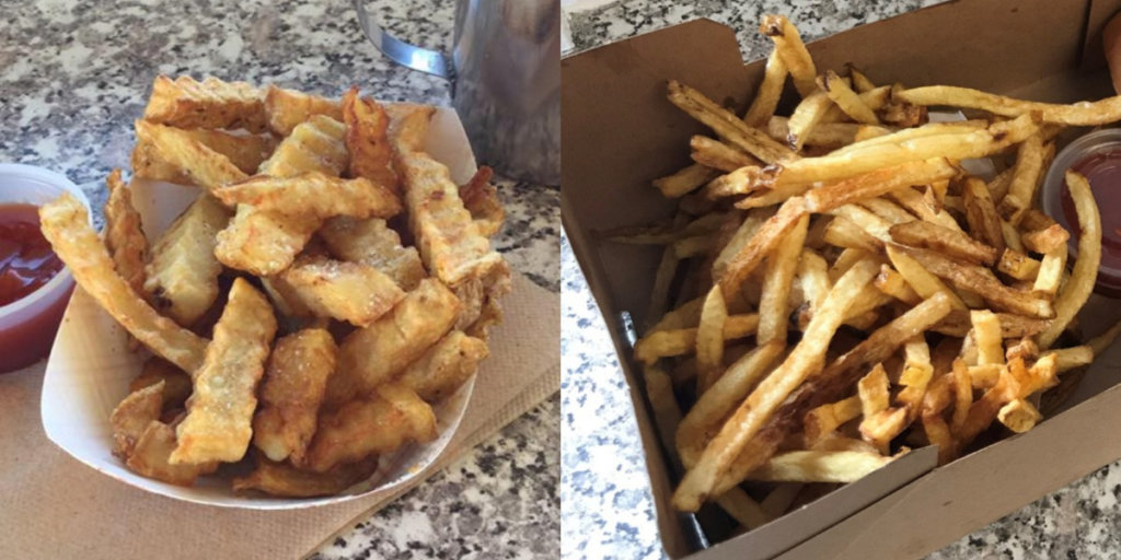 LEFT: Bolley’s Famous Franks’ traditional crinkle-cut french fries in March 2017. RIGHT: Straight-cut french fries served at Bolley’s on Tuesday. (Courtesy of Bolley’s Famous Franks; Sam Shepherd/Kennebec Journal)