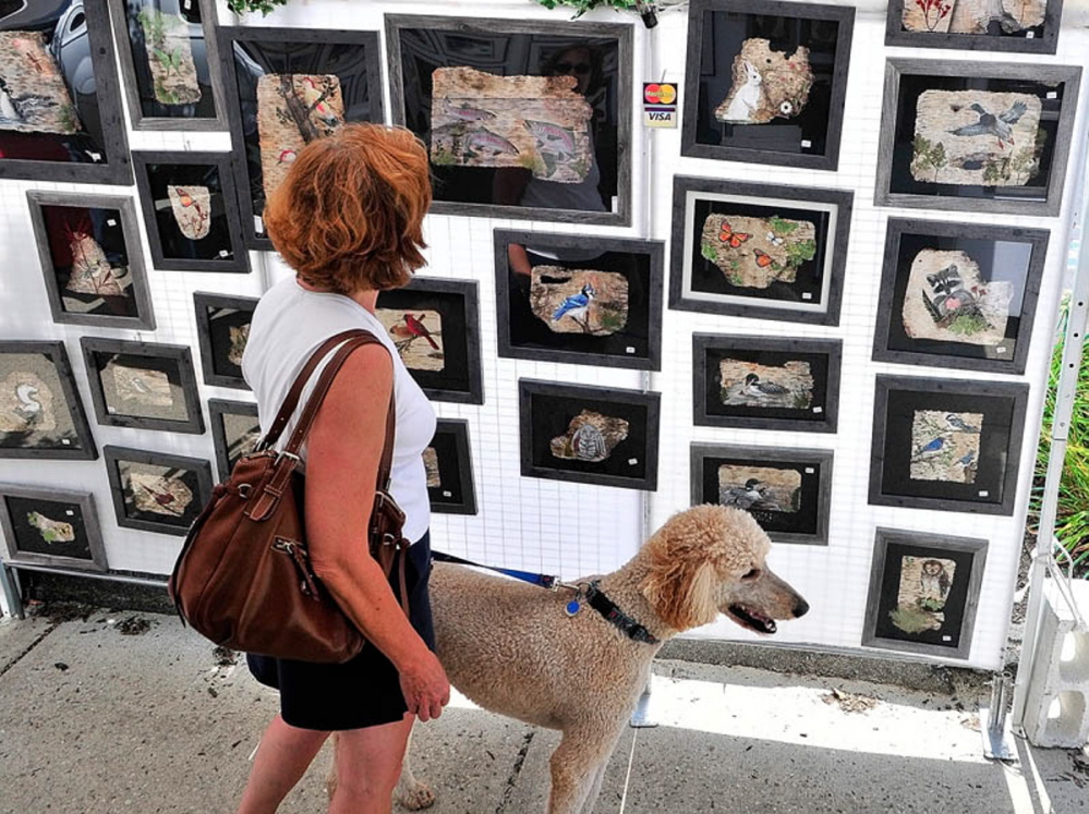 Debbie Farrell and her poodle Rigby look at Sharon Boody-Dean’s paintings on birch bark during the 26th annual Winthrop Sidewalk Art Show on August 17, 2013, in downtown Winthrop. (Staff file photo by Joe Phelan)