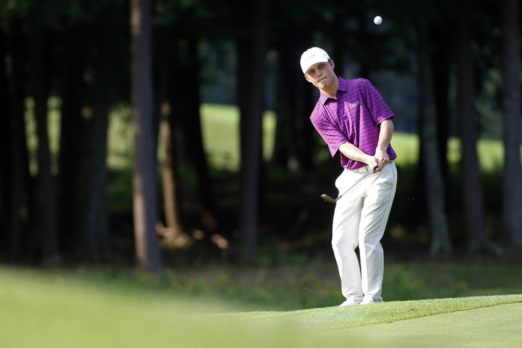 Camden golfer Cole Anderson chips onto the green at Falmouth Country Club on Thursday during the final match of the Maine State Golf Association Match Play Invitational. (Ben McCanna/Portland Press Herald Photo)