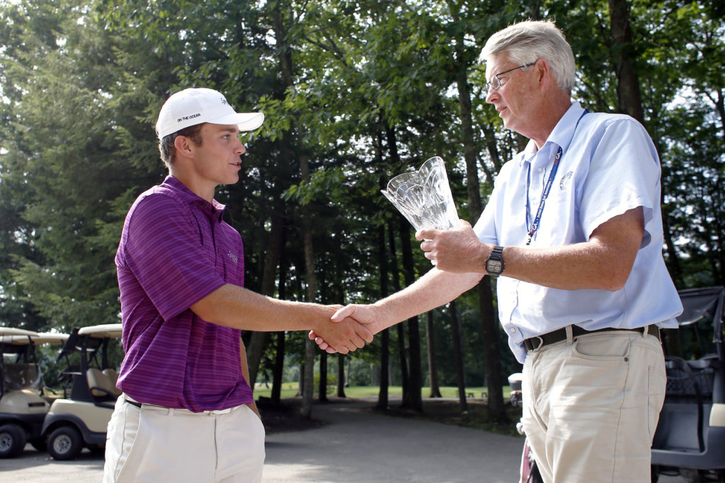Camden golfer Cole Anderson receives a trophy from Rules Official Randy Hodsdon after prevailing against Drew Powell of Holden during the final match of the Maine State Golf Association Match Play Invitational on Thursday at Falmouth Country Club. (Ben McCanna/Portland Press Herald Photo)