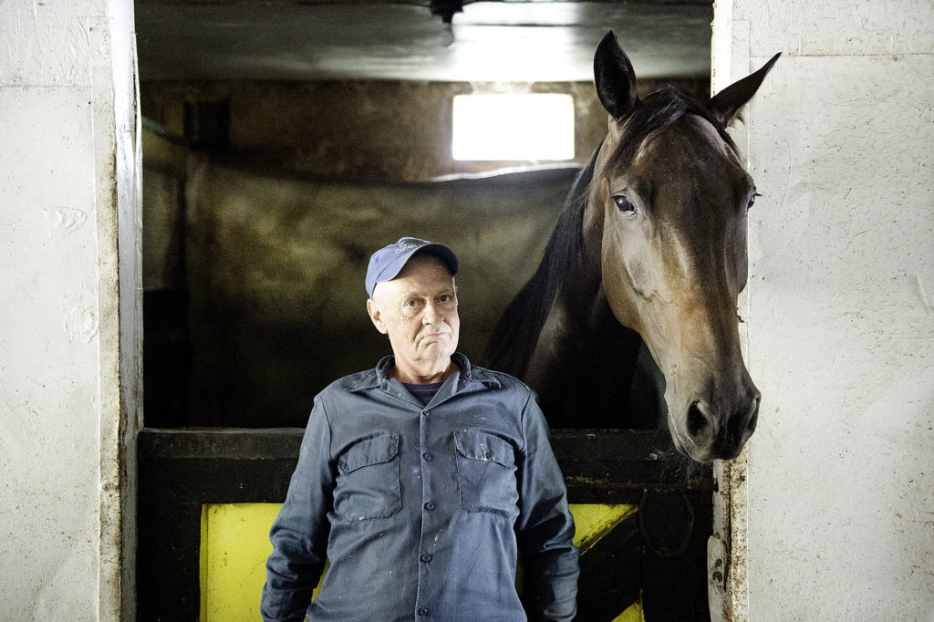 Robin Gray of Farmington cares for Toe Tag at Cushing Stables in Farmington on Wednesday. Gray has been taking care of race horses for 20 years at the stable that is owned by Mike and Charlene Cushing. (Daryn Slover/Sun Journal)