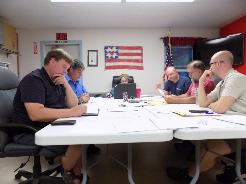 Livermore selectpersons vote Monday night to approve a bid for a concrete pad at the transfer station. From left are Scott Richmond and Chairman Mark Chretien, Administrative Assistant Amy Byron and Selectpersons Tom Gould, Wayne Timberlake and Benjamin Guild. (Pam Harnden/Livermore Falls Advertiser)