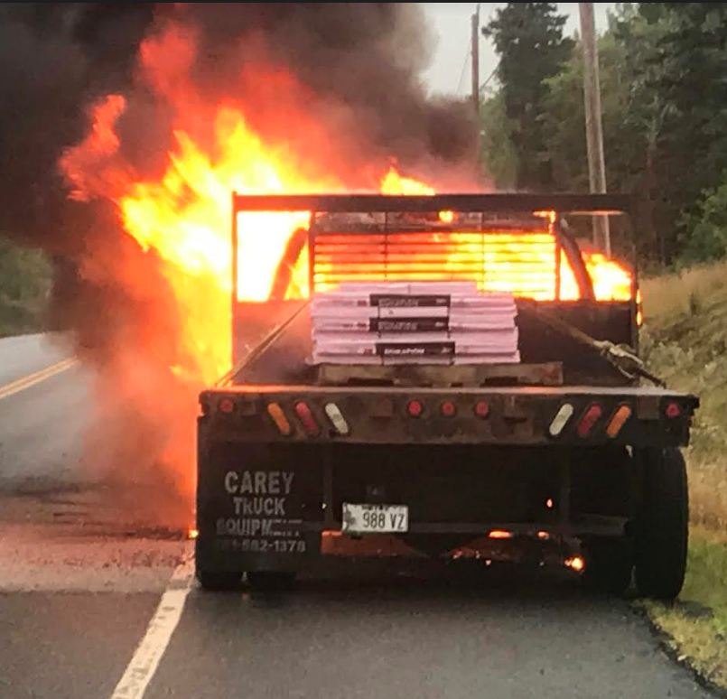 A pickup truck loaded with shingles burns beside Route 4 in Sandy River Plantation on Wednesday morning. Franklin County Deputy Brad Scovil said Stacey Tate was hauling a load of shingles to the Rangeley area for Prime Source Building Products in Kenduskeag when he saw smoke coming from vents, pulled over, got out and saw flames coming from the engine. Tate was not injured, but the truck was demolished, Scovil wrote in an email. (Franklin County Sheriff’s Office)