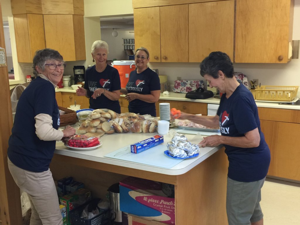 Members of Trinity Lutheran Church prepare for the lobster roll luncheon.