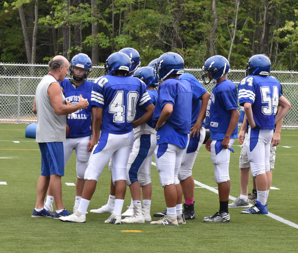 Lewiston coach Bruce Nicholas talks to players during a preseason practice. (Randy Whitehouse/Sun Journal)