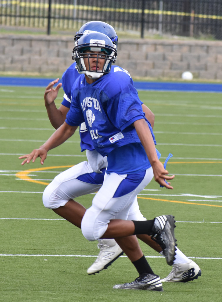 Two Lewiston players participate in a passing drill at practice during the preseason. (Randy Whitehouse/Sun Journal)