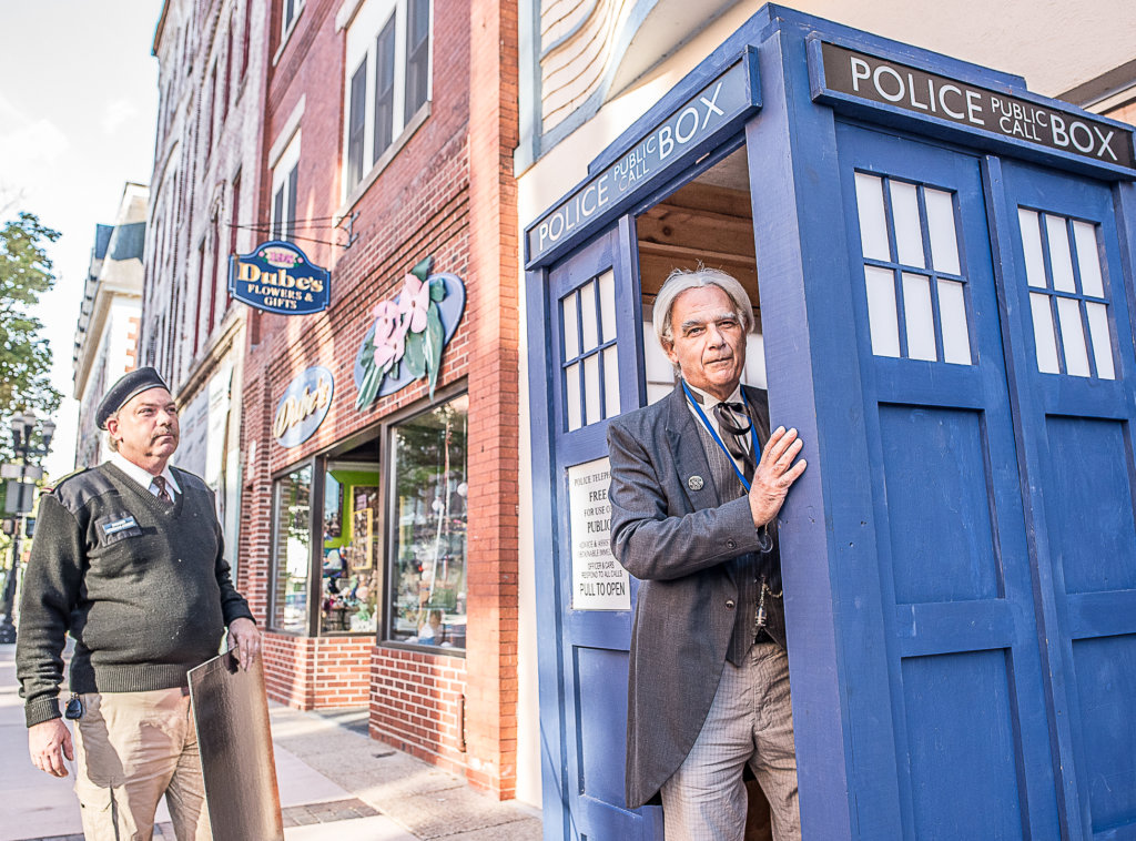 Bud Santos, as the original Doctor Who, peers out of a TARDIS, a fictional time machine and spacecraft in the British TV program “Doctor Who,” on Lisbon Street in Lewiston during Art Walk LA on Friday. Arnold Splan, left, helped make the fictional time machine. Splan is dressed as Brigadier Lethbridge-Stewart. The pair plans to bring the exhibit to the Great Falls Comic Expo in September. (Andree Kehn/Sun Journal)