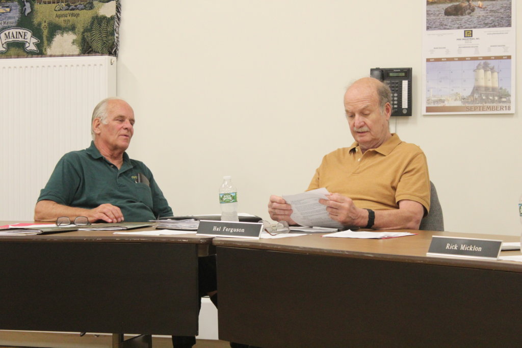 Otisfield Selectmen Lenny Adler and Chairman Hal Ferguson speak Wednesday evening about a donation of a picnic table for the town beach on Pleasant Lake.