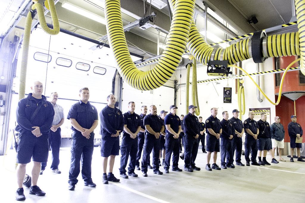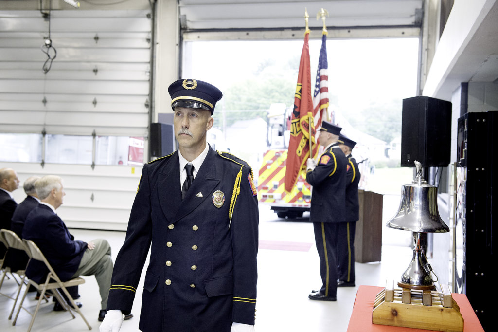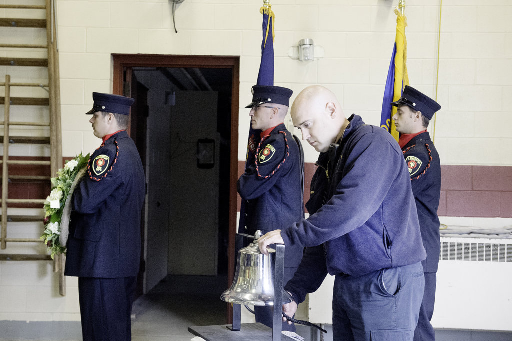 Both ceremonies Tuesday morning featured honor guards and a ceremonial bell-ringing at significant moments. Dozens of fire department and law enforcement personnel stood by solemnly, along with local elected officials and a few residents.