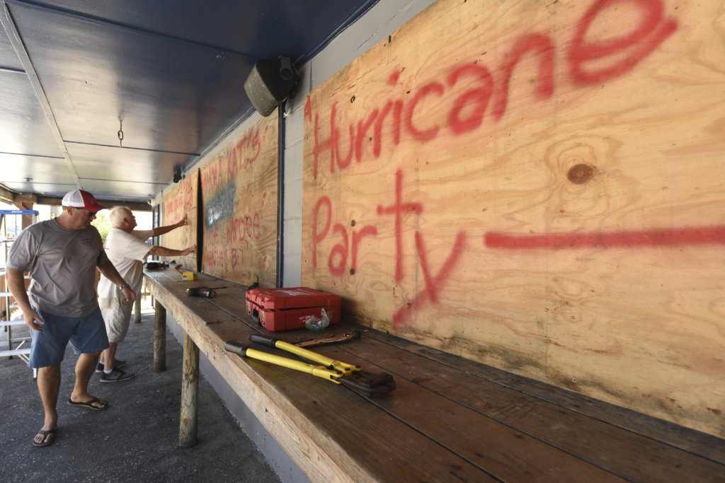 Jim Carter and Rob Quinn board up Lagerheads Tavern in Wrightsville Beach, N.C. as they prepare for Hurricane Florence Monday, Sept. 10, 2018. Hurricane Florence now a category 3 hurricane is expected to make land fall somewhere along the North Carolina coastline towards the end of the week. (Ken Blevins /The Star-News via AP)