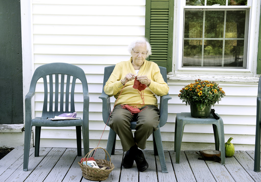 Jean Titus of Auburn knits a pair of mittens Thursday for one of her six great-grandchildren. Titus said she will knit 20 pairs before winter for her great-grandchildren and donate the rest to her church. Born in 1928, Titus turned 90 on Sept. 7. (Daryn Slover/Sun Journal)