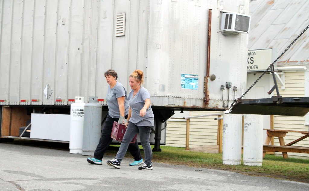 Kat Fronk of New York City, New York and Gail Robinson of Atlanta, Georgia unload pieces of the London Broil booth on Tuesday. It takes a crew of four about four hours to set up the food booth, said Linda Stevens of Tampa, Florida. The 178th Farmington Fair begins Sunday, Sept. 16 and runs through Saturday, Sept. 22. (Dee Menear/Franklin Journal)