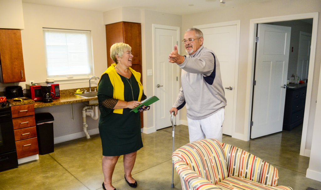 Volunteers of America Chief Operating Officer June Koegel, left, chats with Tim Buckmore in his new home on Friday at the Cabin In The Woods development at Togus. Koegel had been VOA Maine chief executive officer and had worked on the project for several years before moving to the group’s national headquarters. (Staff photo by Joe Phelan/Staff Photographer)
