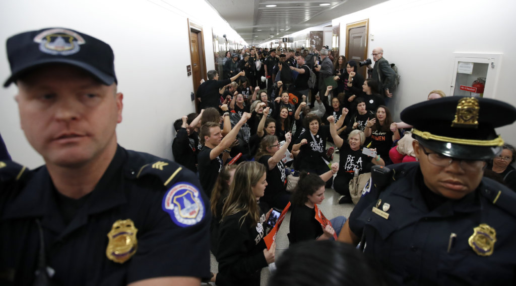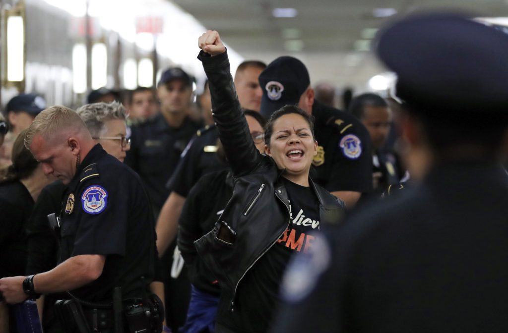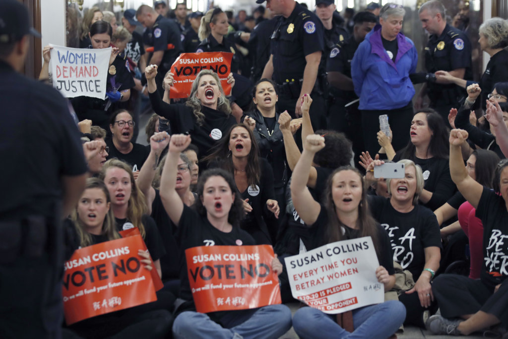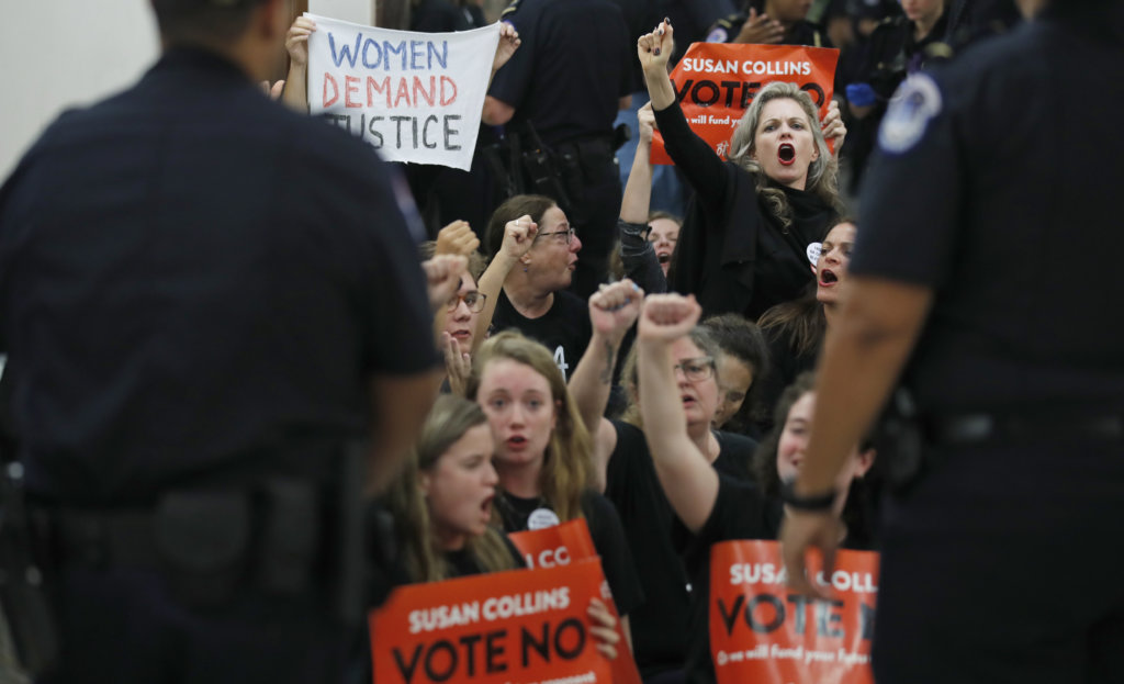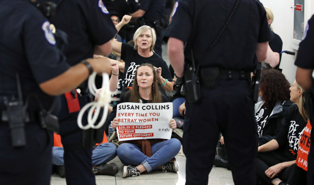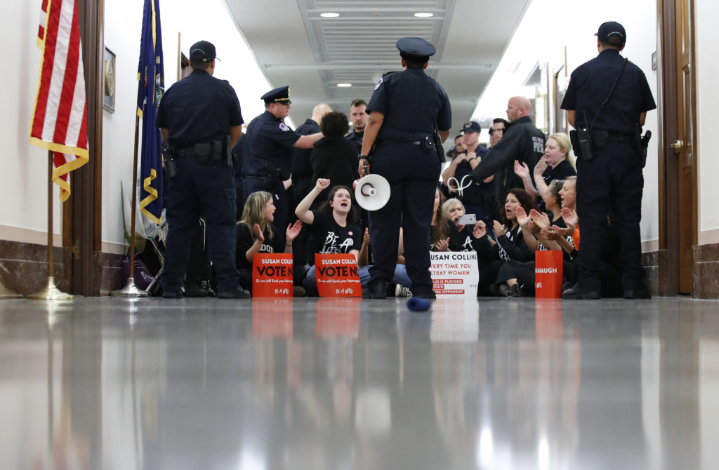 Protesters speak out against Judge Brett Kavanaugh as Capitol Hill Police prepare to make arrests, outside the office of Sen. Susan Collins, R-Maine, on Capitol Hill, Monday, Sept. 24, 2018 in Washington. A second allegation of sexual misconduct has emerged against Judge Brett Kavanaugh, a development that has further imperiled his nomination to the Supreme Court, forced the White House and Senate Republicans onto the defensive and fueled calls from Democrats to postpone further action on his confirmation. President Donald Trump is so far standing by his nominee. (AP Photo/Alex Brandon)