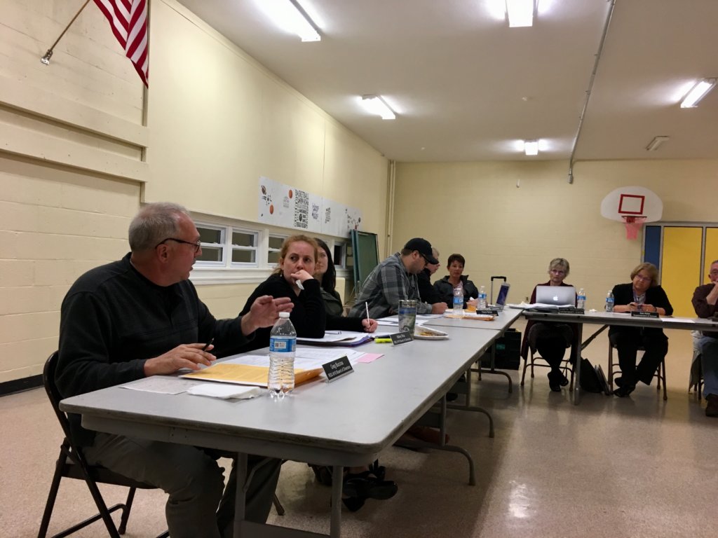 Regional School Unit 10 Director Greg Buccina of Rumford, left, makes a point at Monday night’s board meeting in Rumford. (Marianne Hutchinson/Rumford Falls Times)