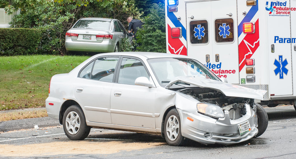 Lewiston police officer Todd MacWhinnie, background, looks into a vehicle that collided with another at Webster Street and Webber Avenue in Lewiston on Tuesday afternoon. Two people, whose names were not released, were taken to a hospital. The 2005 Hyundai Sonata driven by Gilbert Morrison and the 2006 Hyundai Accent owned by Nimco Abdi were towed from the scene. (Russ Dillingham/Sun Journal)