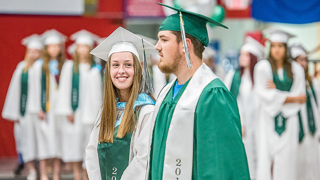 MacKenzie Treadwell smiles at Justin Day as the pair march into the June 2018 Leavitt Area graduation at The Colisee in Lewiston. (Sun Journal file photo)